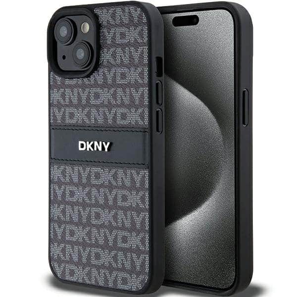 Husa Iphone 15 – Dkny Leather Monogram Pattern Metal Logo Magsafe – Negru